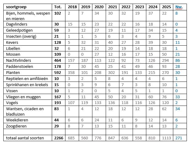 In het overzicht hieronder is per soortgroep aangegeven hoeveel verschillende soorten er sinds 2018 zijn waargenomen. Onder ‘Tot.’ (totaal) staat het totaal door de jaren heen. Daar zitten ook hele oude gegevens bij, soms wel tot 100 jaar geleden. De laatste kolom geeft het aantal nieuwe (Nw.) soorten die in 2025 zijn gevonden.