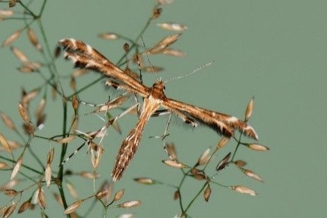 Onder de nieuwe soorten zijn er 3 zeldzame en 2 zeer zeldzame soorten gevonden. Eentje daarvan is de vlinder die hiernaast is afgebeeld, de muizenoorvedermot. In Nederland zeldzaam en vooral een vlinder van de duinenkust in het westen van ons land. Soms erg lokaal in het binnenland op tamelijk droge zandgronden. Zoals bij ons dus. Is deze soort voor Nederland al bijzonder (=zeldzaam), in onze omgeving zeer zeldzaam.
